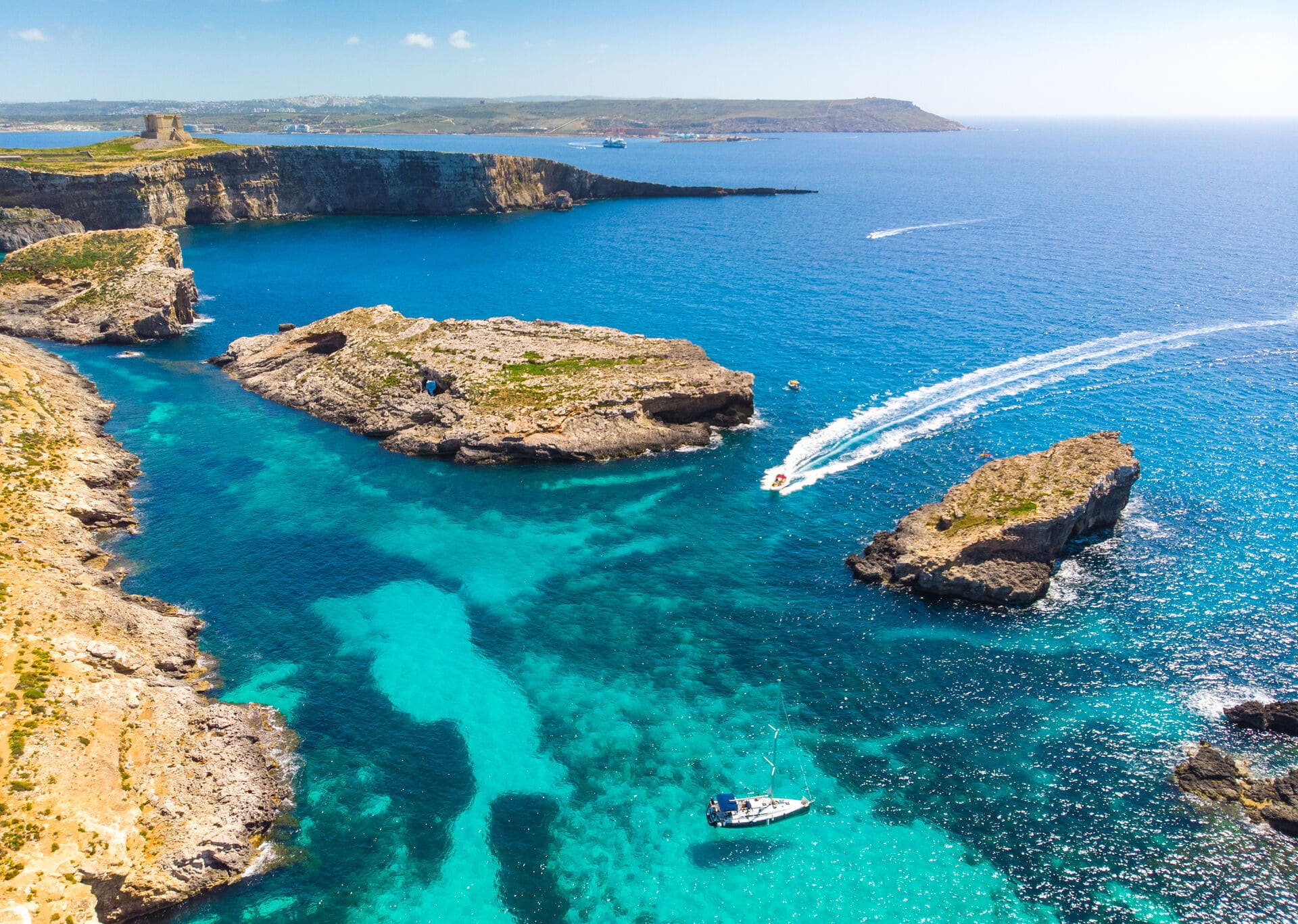 Comino – die dritte im Bunde - Auf der kleinsten bewohnten Insel des Trios (3,5 km2 mit gerade einmal 3 Bewohnern) gilt es die unberührte Natur bei einer kleinen Wanderung zu entdecken oder sich ganz der Blauen Lagune hinzugeben. Paddeln, Schnorcheln, Stand-Up-Paddling und Sonnenbaden stehen hier ganz oben auf der Liste. Also einfach mal die Seele baumeln lassen und das azurblaue Wasser der Lagune genießen.